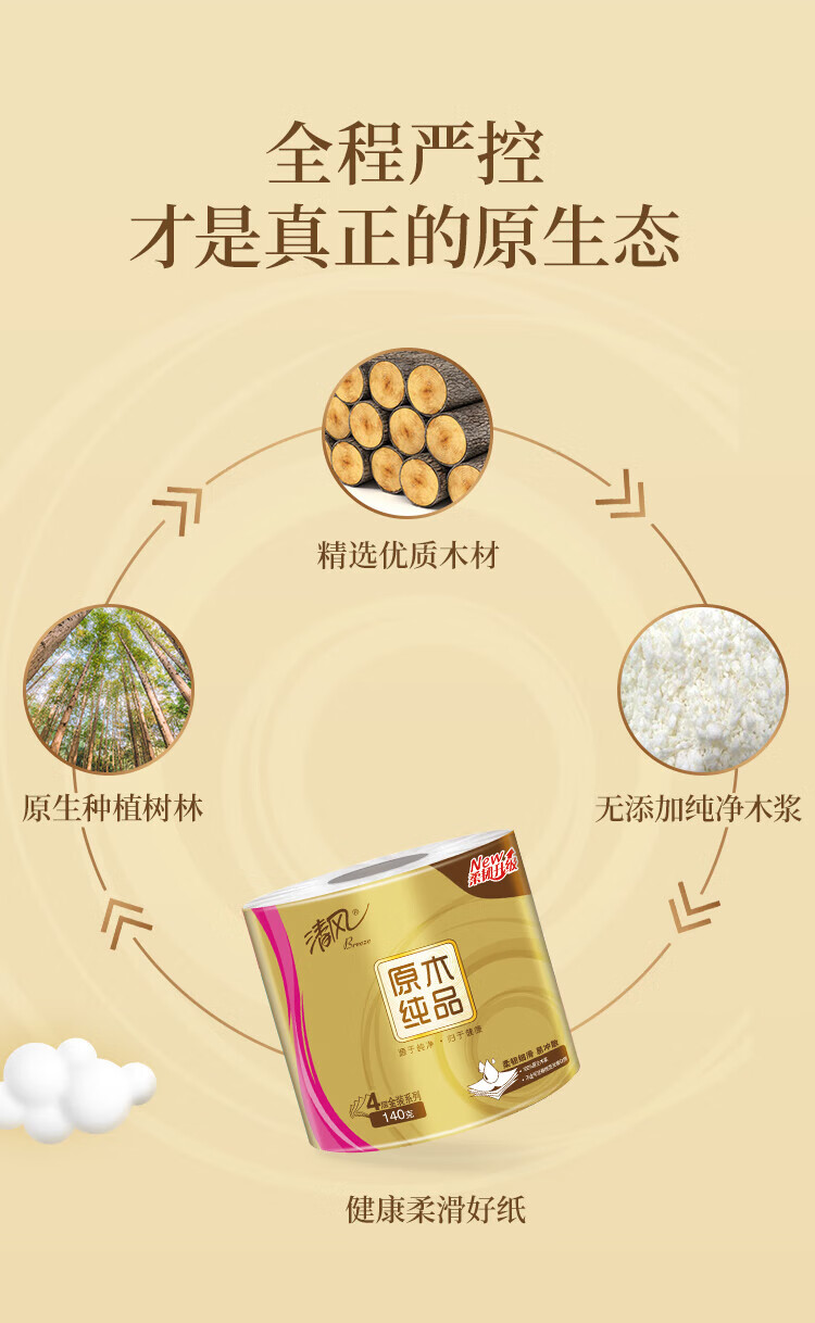 自營(yíng)清風(fēng) 有芯卷紙 原木金裝 4層加厚140克*30卷 衛(wèi)生紙卷筒紙紙巾 整箱