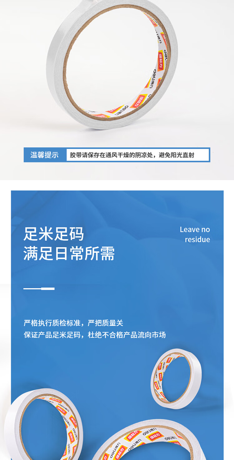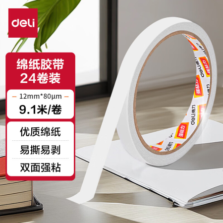 商品名稱:得力30401 高粘棉紙雙面膠帶 12mm*10y(9.1m/卷) 白色 24卷/袋