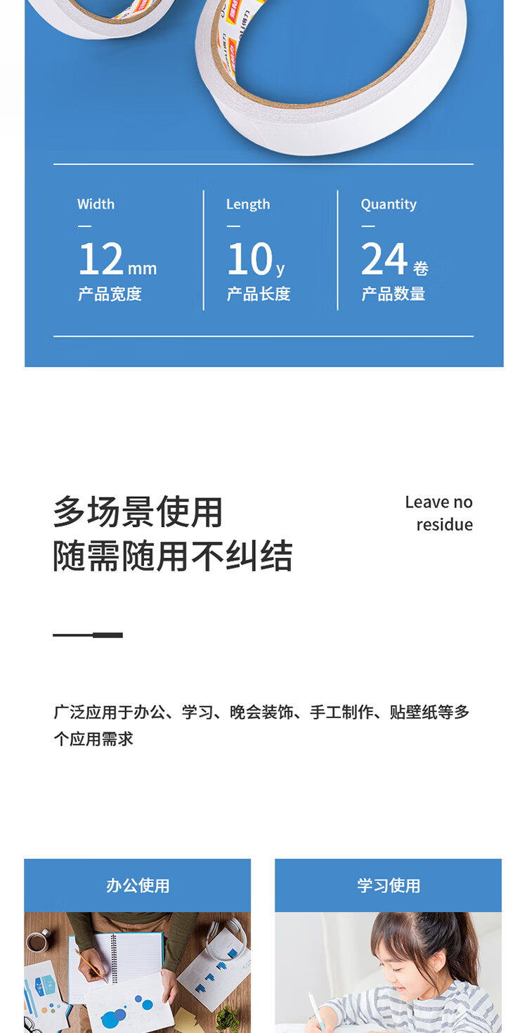 商品名稱(chēng):得力30401 高粘棉紙雙面膠帶 12mm*10y(9.1m/卷) 白色 辦公用品 單卷裝