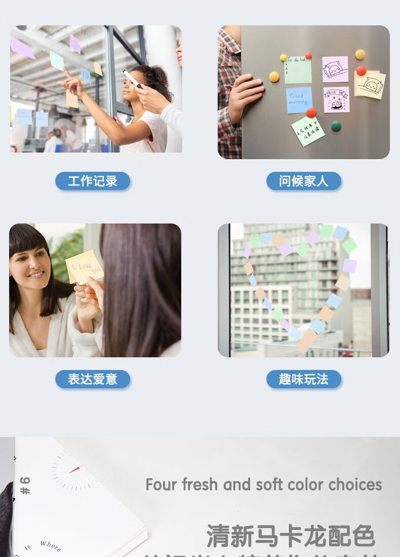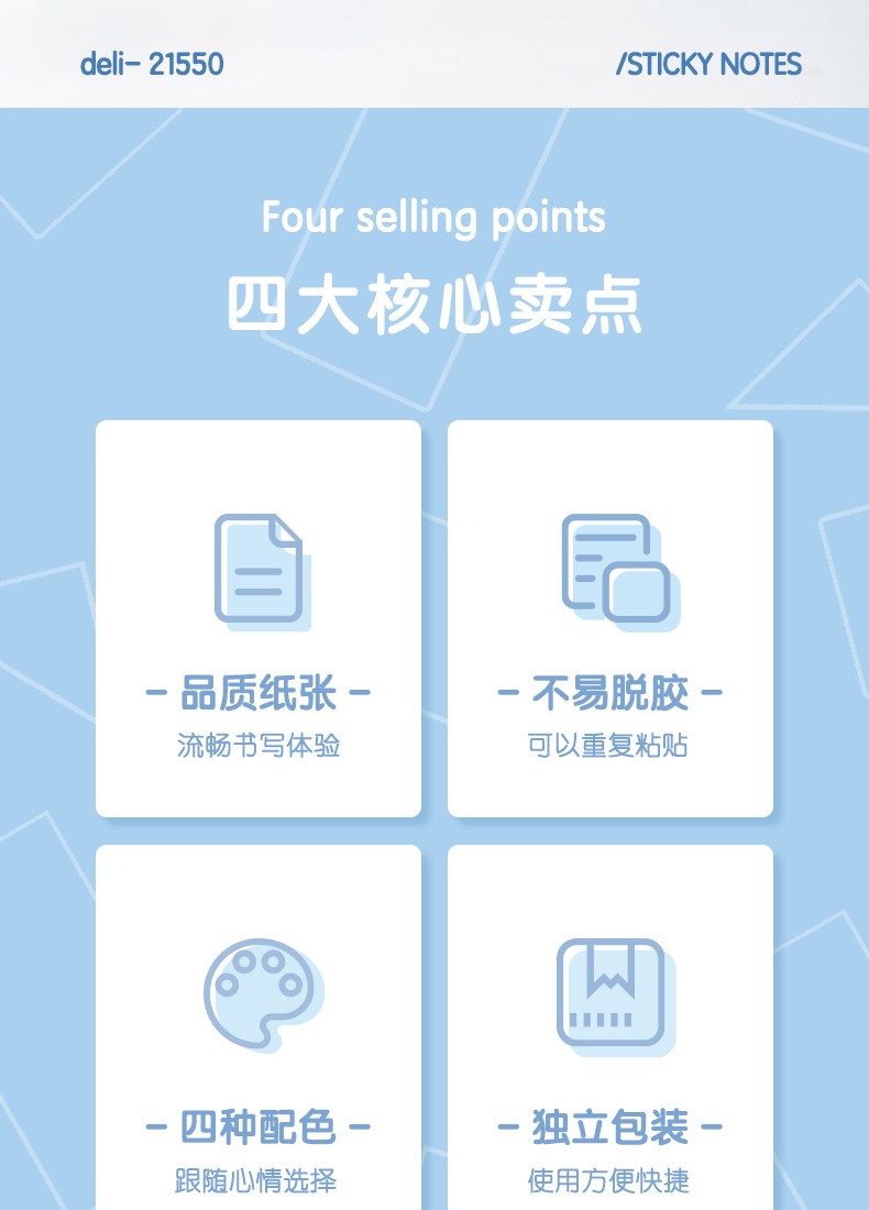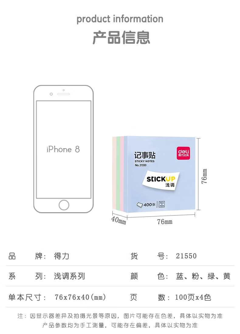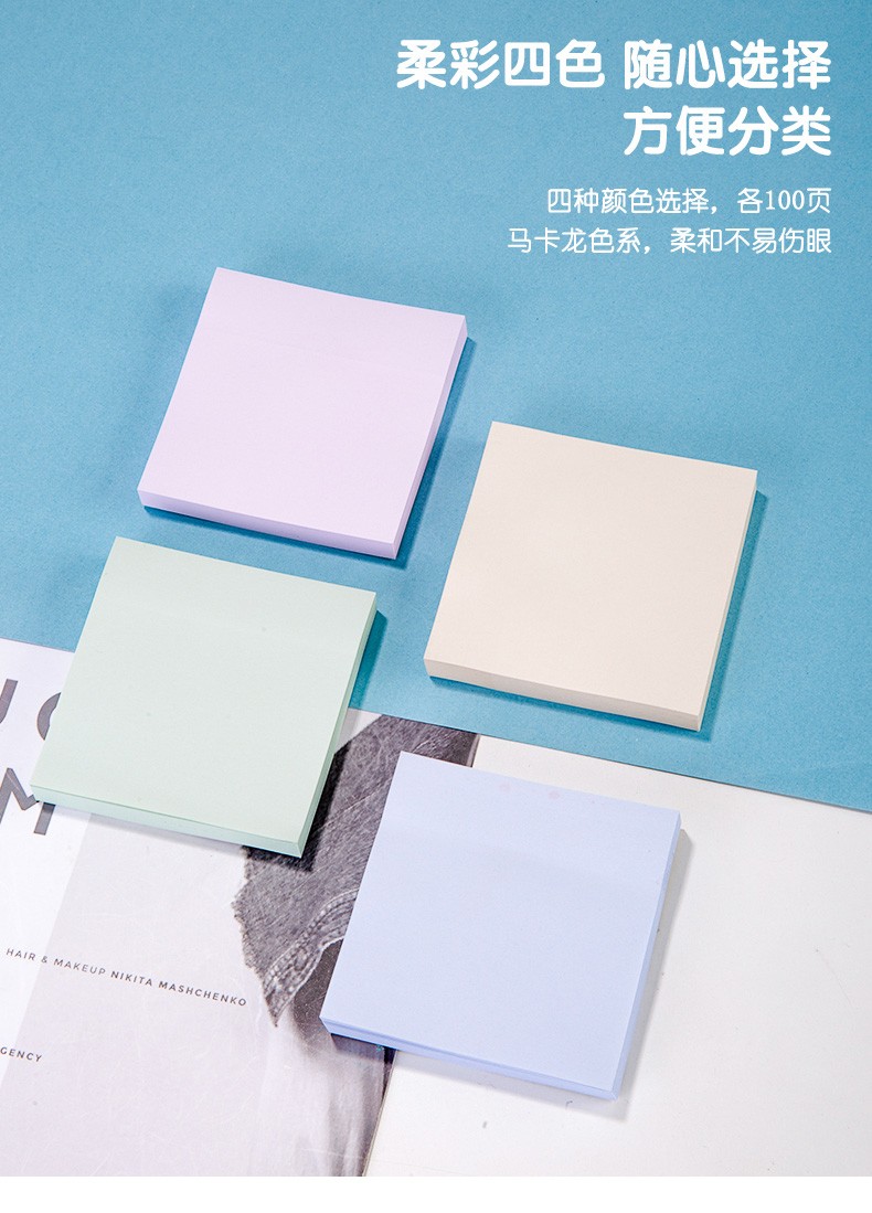 商品名稱:得力21550 便利貼 4色淺調(diào)系列淡彩簡(jiǎn)約便簽本 76*76mm記事貼/自粘留言本 400張/袋