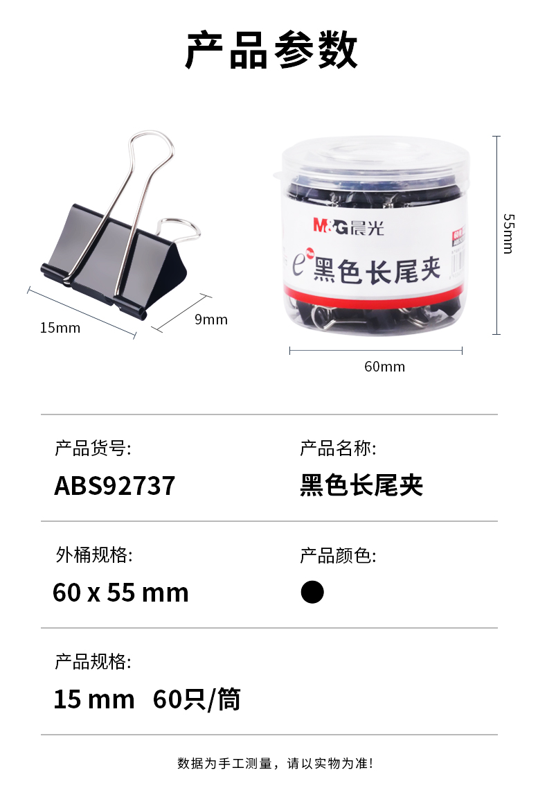 商品名稱:晨光ABS92737 黑色長尾夾 6#15mm小號(hào)金屬票據(jù)夾 Eplus系列燕尾夾 60只/筒