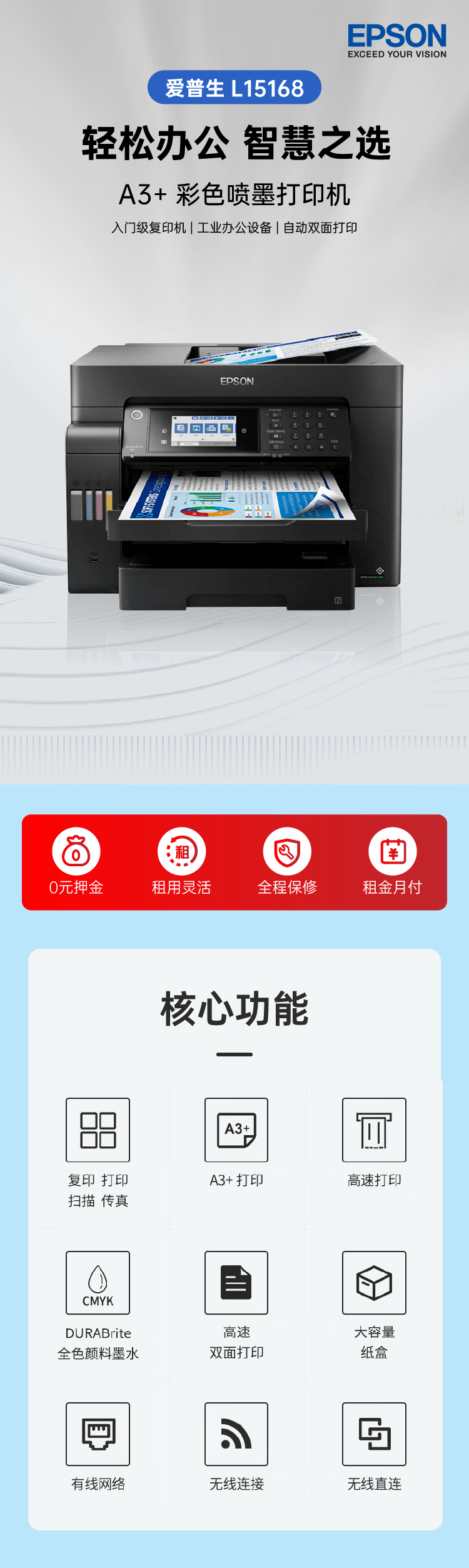 商品名稱:愛普生彩色噴墨復(fù)合機(jī)出租 茂名多功能一體機(jī)租賃 彩色/A3/中低速(月)