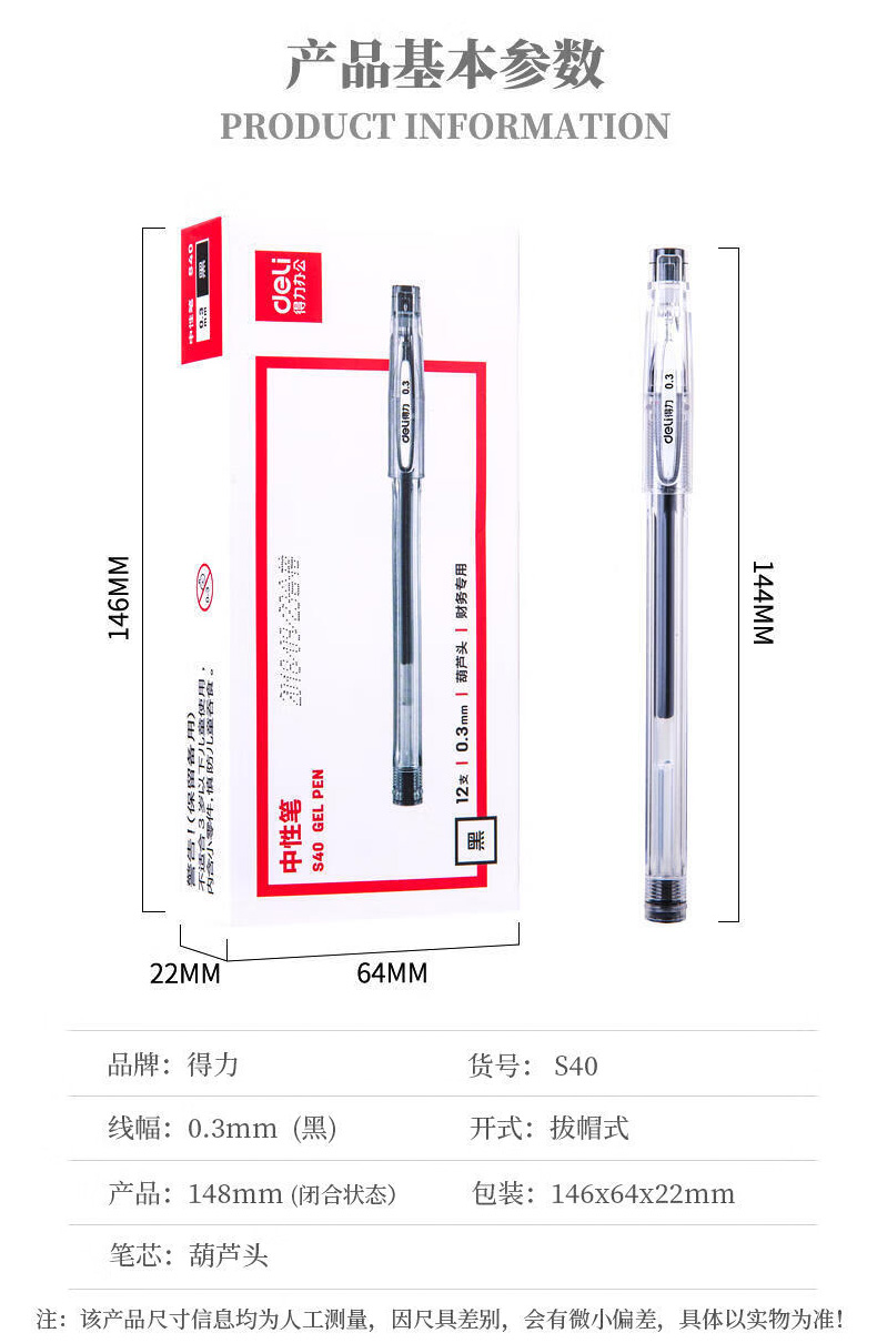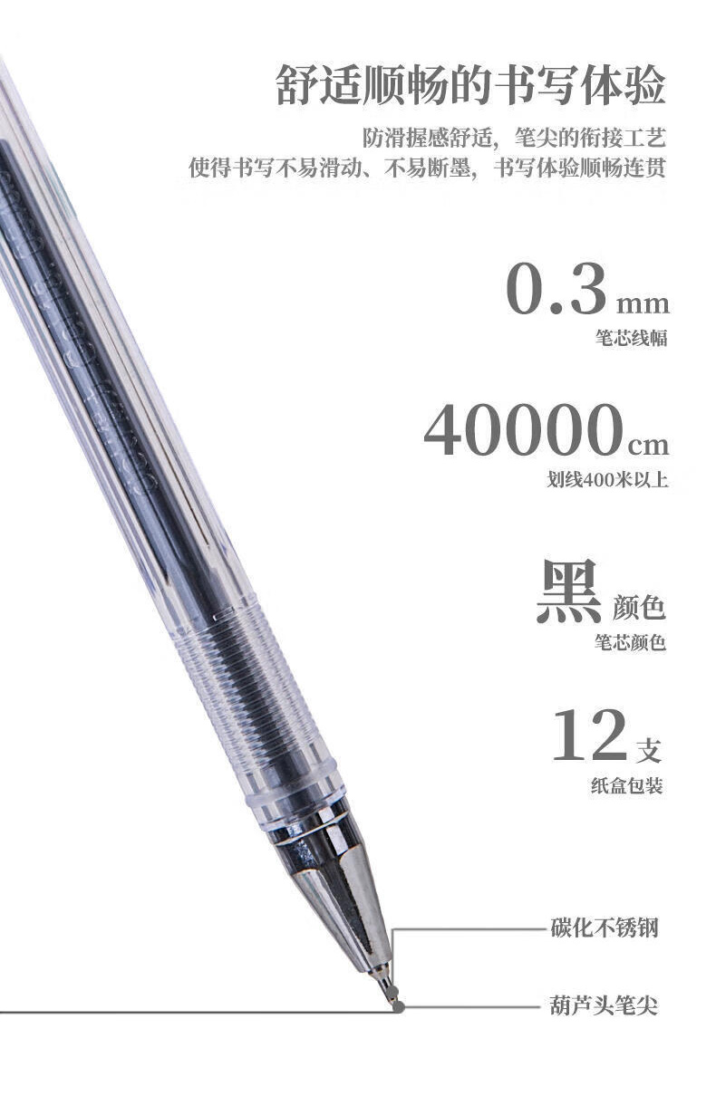 商品名稱:得力S40 黑色中性筆 0.3mm葫蘆頭簽字筆水筆碳素筆速干細筆 12支/盒